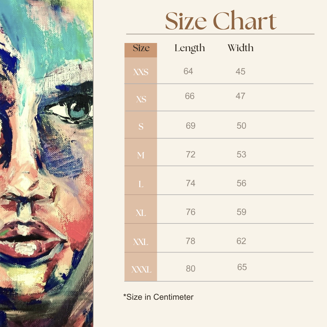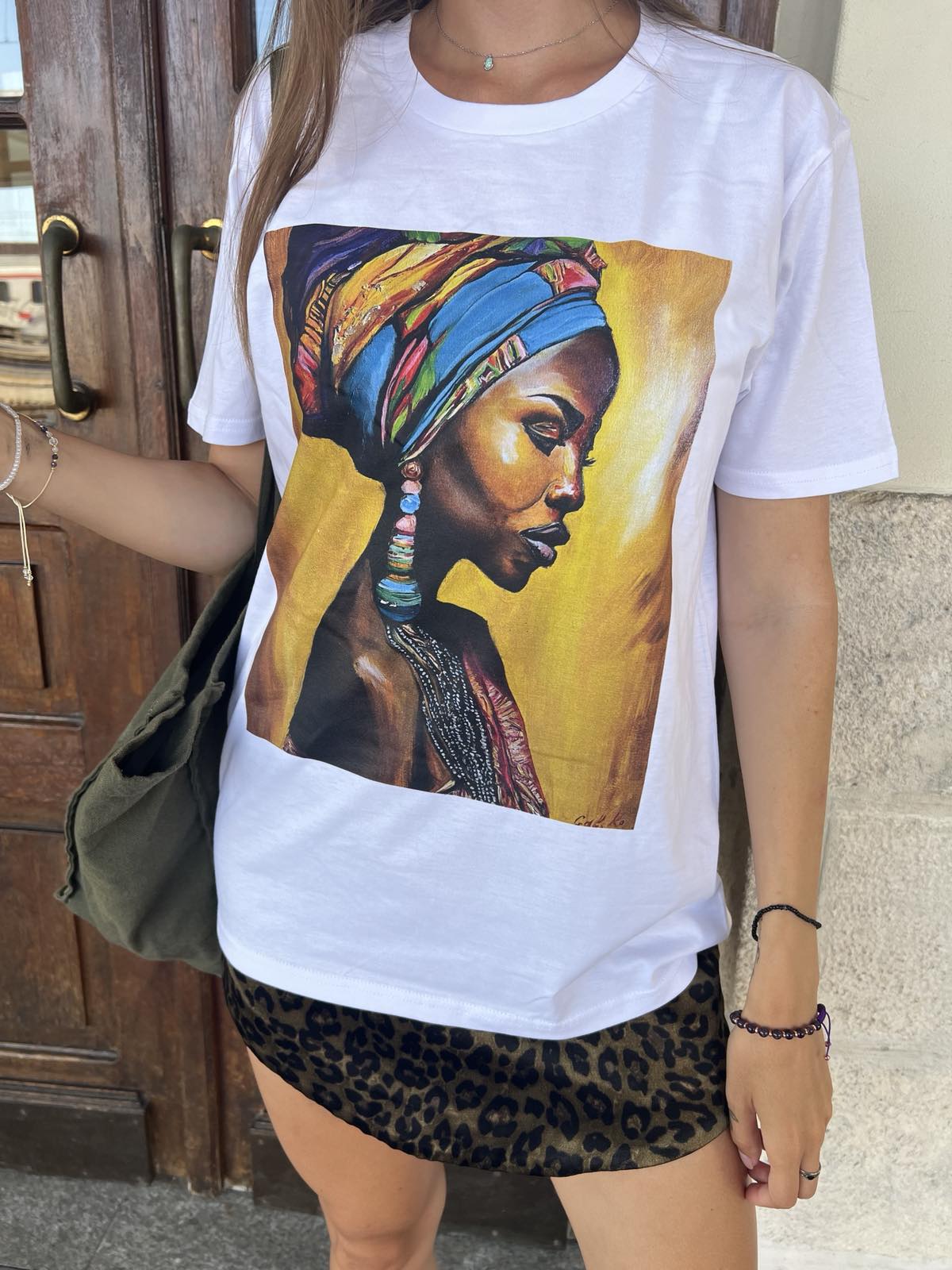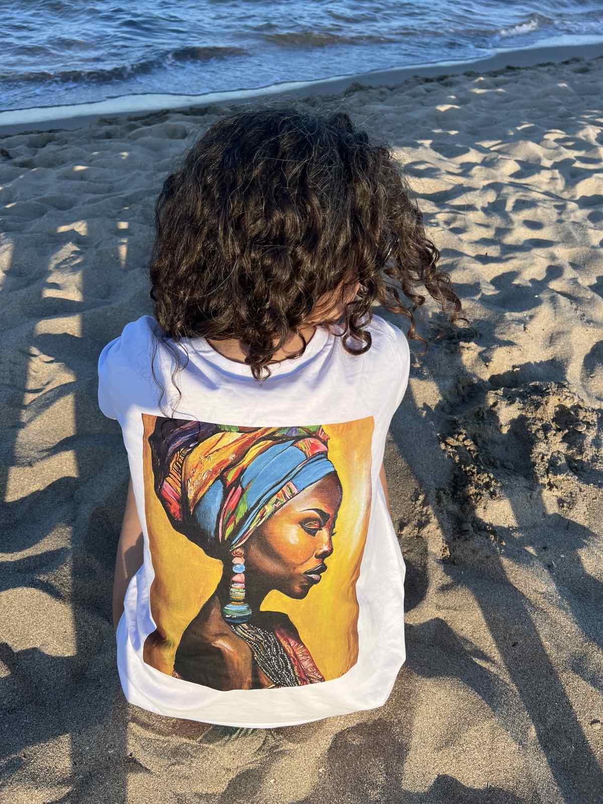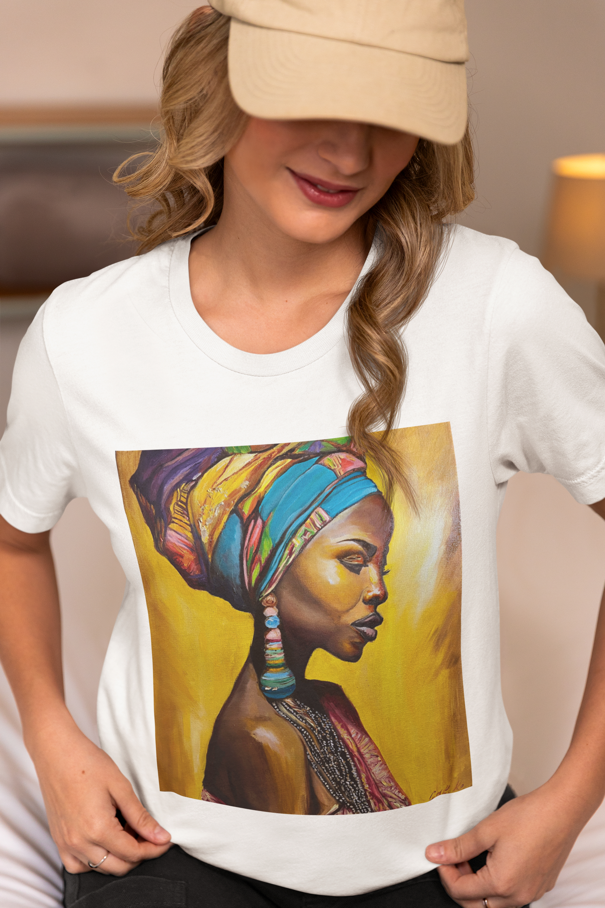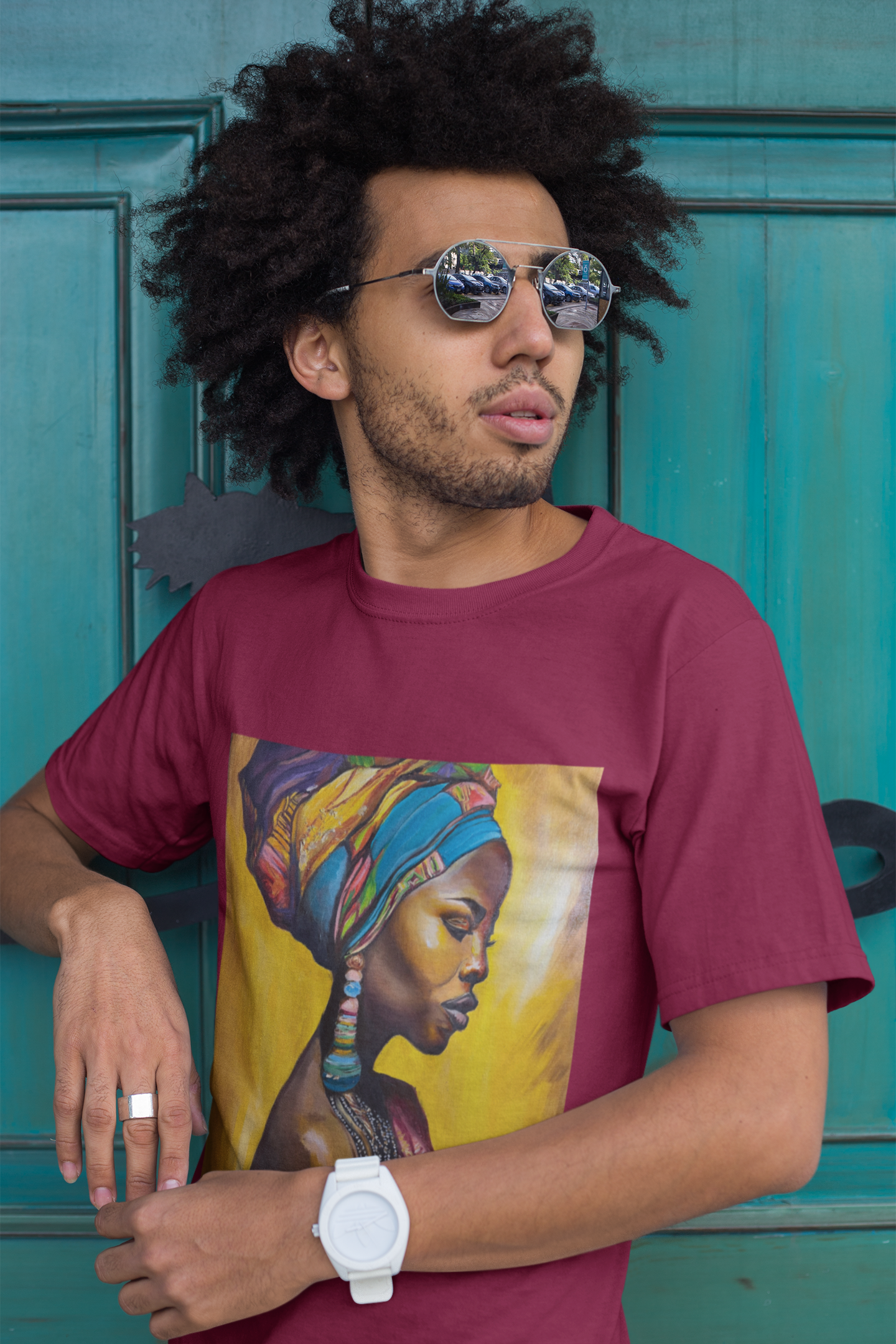 Открийте красотата на културата, силата и артистичността с тази зашеметяваща тениска, изобразяваща ярък портрет на жена с цветна превръзка и бижута. Това произведение на изкуството, което може да се носи, излъчва елегантност, сила и индивидуалност.  Перфектна дреха за всеки повод. Нарисувана с маслени бои, отпечатана върху мека, първокласна памучна материя.