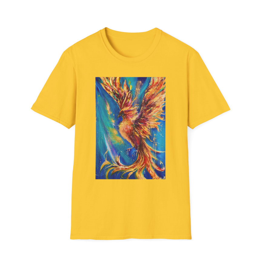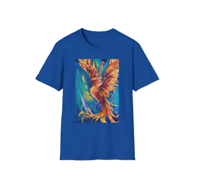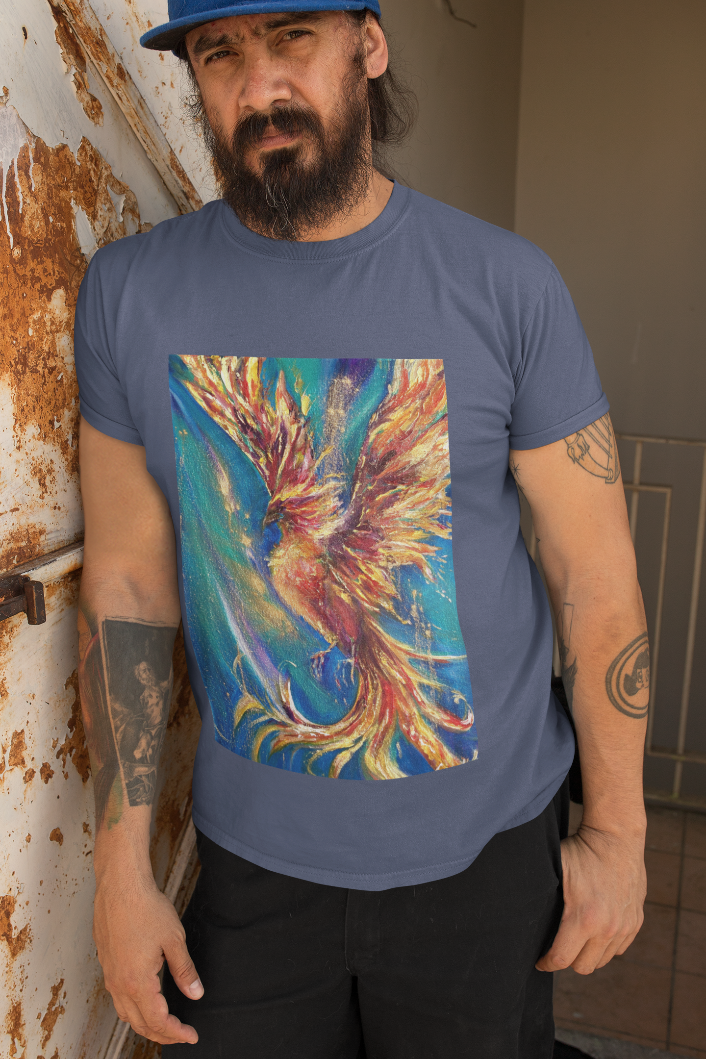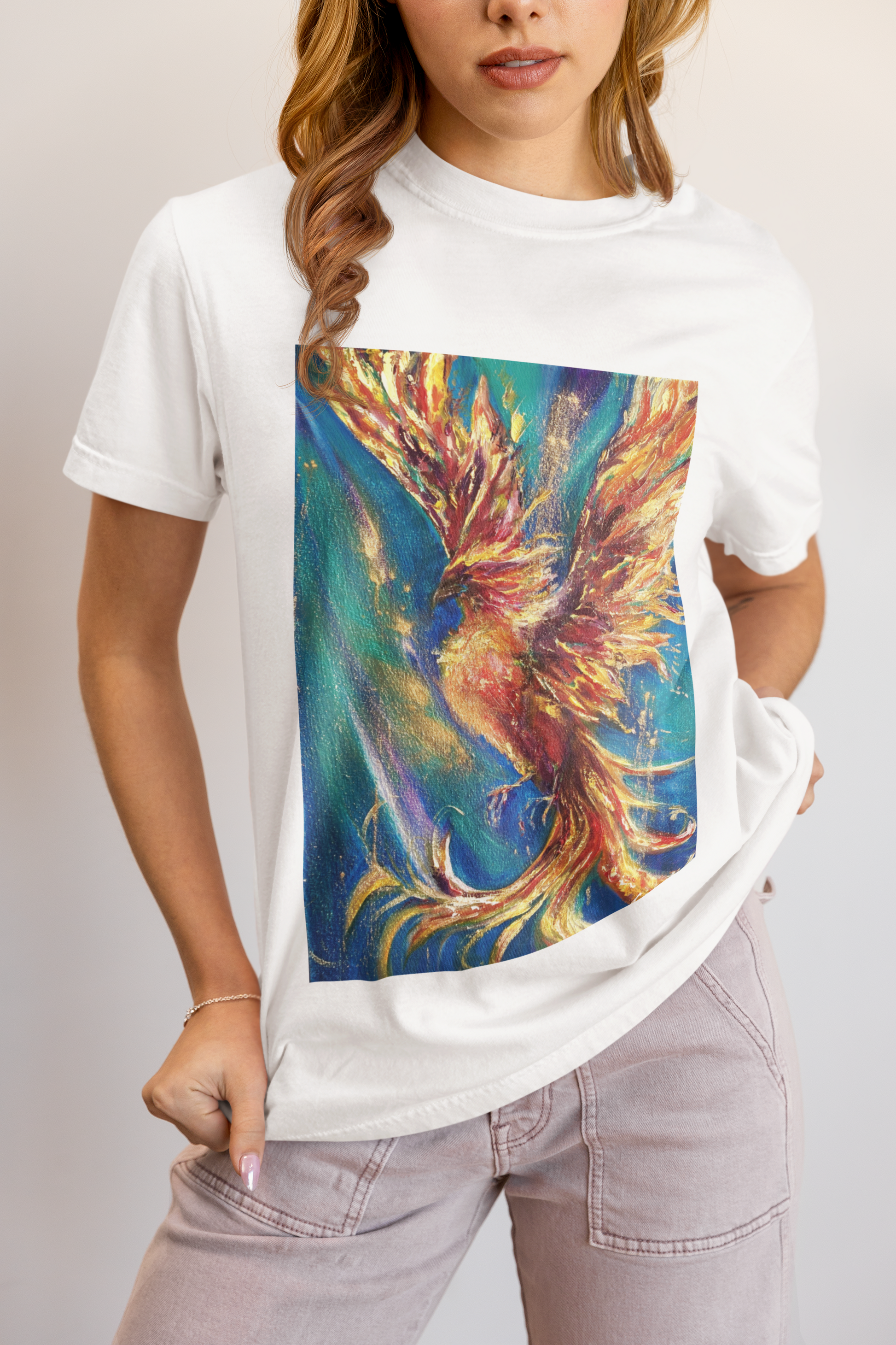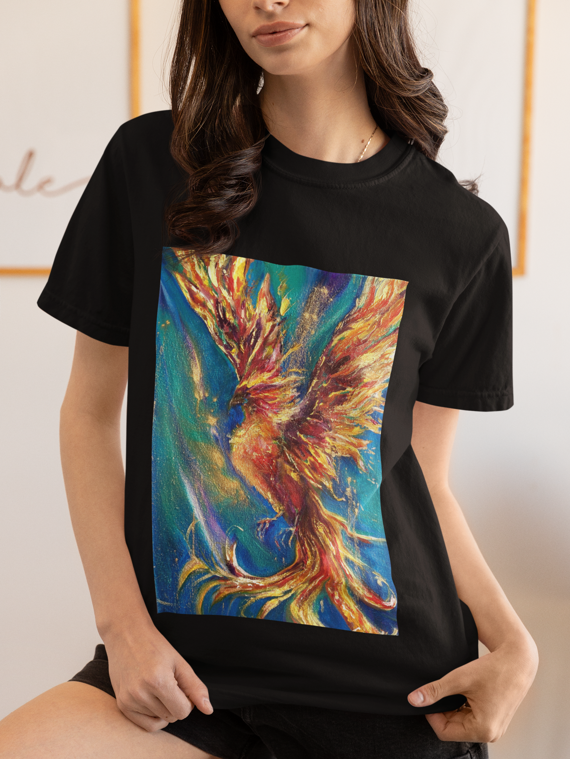 Този ярък, огнен дизайн с феникс представлява прераждане, сила и трансформация. Детайлният маслен принт улавя величествените крила на митичната птица, космическата енергия и сияйните пламъци, което я прави перфектен символ на устойчивост и обновление. От маслени бои върху първокласен принт и 100% органичен памук.